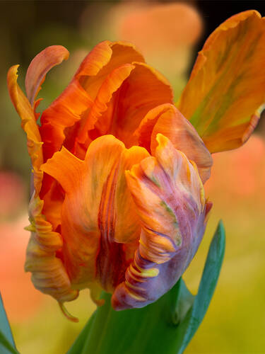 Die Blüte von Amazing Parrot strahlt in einem Violettrot. Der orangefarbene Rand ist gekräuselt und gerüscht. Dabei sieht jede Blüte etwas anders aus. Zum Ende der Blüte kommen Orange- und Rosatöne dazu. Die Blüten stehen auf kräftigen Stielen und sind zum Vasenschnitt geeignet.