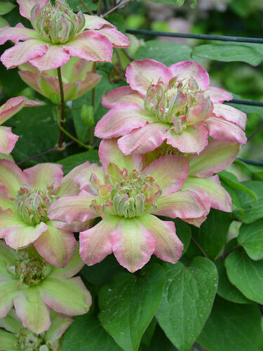 Clematis-Sorten, die an vorjährigen Trieben im Mai oder Juni und dann noch an neuen Trieben blühen. Rückschnitt zwischen Ende Februar und Anfang April auf 100-150 cm.