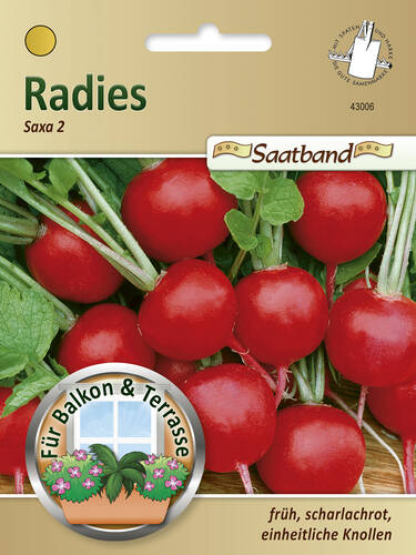 Die altbekannte Sorte 'Saxa 2' wurde speziell für den sehr frühen Anbau im Freiland gezüchtet. Die knackigen, scharlachroten Knollen sind von würzigem Geschmack. Das Laub ist kurz und fein, das Fleisch zeigt sich weiß und schön fest.