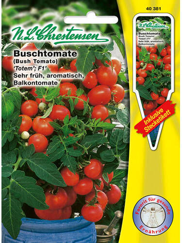 Totem F1 ist eine besonders aromatische, frühreifende, mittelstark wachsende Sorte mit geringer Laubentwicklung und mittelgroßen Früchten. Sie eignet sich ideal für Töpfe, Schalen und Balkonkästen. Die Aussaat erfolgt unter Glas von Februar bis April. Um die Keimung zu verbessern sollten die Samen 48 Stunden in einem feuchten Tuch vorquellen und dann säen. Ab Mitte Mai können die Pflanzen ins Freiland gepflanzt werden. Beansprucht wird ein warmer, windgeschützter Standort, nährstoffreicher, humoser Boden und ausreichend Wasser und Dünger.